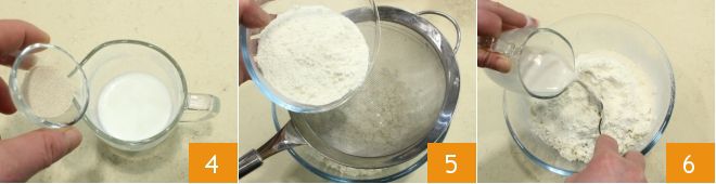 Lösen Sie in der Zwischenzeit die Trockenhefe in der Milch auf 4, sieben Sie das Mehl in die Schüssel mit dem inzwischen kalten Reis 5, gießen Sie die Milch, in der Sie die Hefe aufgelöst haben 6 und mischen Sie mit einer Gabel, um die Masse zu vermengen.