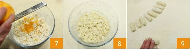 Aromatisieren Sie mit der abgeriebenen Orangenschale 7, mischen Sie gut mit einem Löffel. Lassen Sie den Teig etwa eine halbe Stunde ruhen 8, dann rollen Sie ihn auf einer leicht bemehlten Fläche aus und formen Sie gut geformte Stäbchen von etwa 10 cm Länge 9.