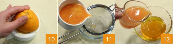 Kümmern Sie sich in der Zwischenzeit um die Begleitsauce: Pressen Sie den Saft von zwei Orangen (ca. 65 ml) aus 10. Geben Sie den Saft durch ein Sieb 11 und fügen Sie ihn dem Honig hinzu 12
