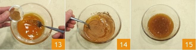 Aromatisieren Sie die Sauce mit Zimtpulver 13, mischen Sie die Mischung (14-15) und passieren Sie sie durch ein feines Sieb, um eventuelle Klumpen zu entfernen, und behalten Sie die Sauce bei.
