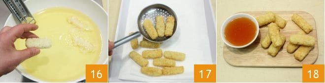Kümmern Sie sich nun um das Frittieren: Erhitzen Sie das Samenöl in einer Pfanne und wenn es heiß genug ist (etwa 170°), tauchen Sie die Reiskrapfen ein 16. Sobald die Krapfen von allen Seiten schön goldbraun sind, nehmen Sie sie aus der Pfanne und lassen Sie das überschüssige Öl auf einem Blatt Küchenpapier abtropfen 17. Ihre Reiskrapfen sind bereit, zusammen mit der köstlichen Honig-Orangen-Sauce genossen zu werden 18.