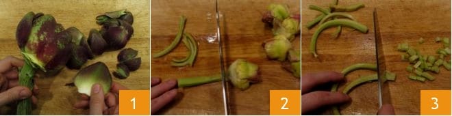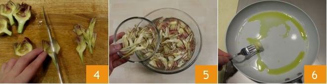 Um die Rigatoni mit Artischocken, Oliven und Kapern zuzubereiten, beginnen Sie damit, reichlich Salzwasser zu erhitzen und die Kapern zu entsalzen, indem Sie sie sorgfältig abspülen. Säubern und schneiden Sie die Artischocken, aber bevor Sie sie anfassen, schützen Sie Ihre Hände mit Latexhandschuhen oder reiben Sie sie mit Zitrone ein, um zu verhindern, dass sie schwarz werden. Entfernen Sie die äußeren, dickeren Blätter 1 bis zu den zarten, dann schneiden Sie mit einem Messer die härteren Spitzen ab und entfernen Sie auch den Stiel 2. Schälen Sie nun die Stiele, indem Sie den äußeren, faserigen Teil entfernen, schneiden Sie sie dann in Würfel oder Scheiben 3 und legen Sie sie in eine Schüssel mit Wasser und Zitrone, damit sie nicht schwarz werden.
