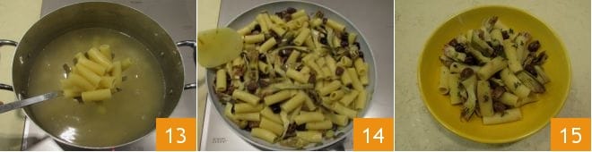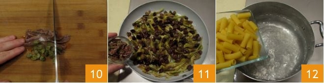 Hacken Sie die Anchovis und die entsalzten Kapern 10, dann fügen Sie beide zu den Artischocken hinzu 11 und kochen Sie weitere 5 Minuten. Schalten Sie das Feuer aus und halten Sie die Sauce warm. Kochen Sie die Pasta im kochenden Salzwasser 12.