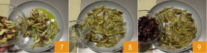 Fügen Sie nun die Artischocken hinzu 7. Braten Sie sie an, würzen Sie sie mit Salz und Pfeffer und löschen Sie sie schließlich mit dem Weißwein ab 8. Nach 5 Minuten Garzeit fügen Sie die entsteinten Oliven hinzu 9 und vermengen Sie die Zutaten gut.