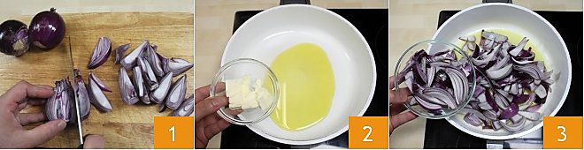 Um das Rindersteak mit süß-sauren Zwiebeln zuzubereiten, beginnen Sie damit, die roten Zwiebeln zu schälen. Schneiden Sie sie in 4 Teile und dann in kleinere Spalten 1, nehmen Sie dann eine antihaftbeschichtete Pfanne und erhitzen Sie das Olivenöl extra vergine. Wenn es heiß ist, fügen Sie die Butter hinzu 2. Sobald die Butter geschmolzen ist, geben Sie die roten Zwiebelspalten hinzu 3 und lassen Sie sie sanft anbraten.