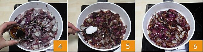 Wenn die roten Zwiebeln anfangen weich zu werden, fügen Sie den Balsamico-Essig 4 und den Zucker 5 hinzu. Salzen Sie nach Geschmack und lassen Sie sie schmoren, bis sie eine weiche, aber nicht zerfallene Konsistenz erreichen 6.