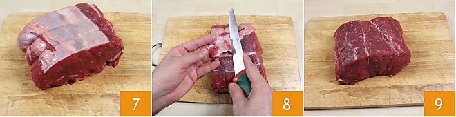 Kümmern Sie sich jetzt um das Fleisch: Nehmen Sie das Fleisch mindestens eine Stunde vor dem Kochen aus dem Kühlschrank, damit es nicht zu kalt, sondern auf Zimmertemperatur ist. Legen Sie das Roastbeef oder das Entrecote auf ein Schneidebrett 7 und entfernen Sie mit einem scharfen Messer die Fettschicht auf der Oberfläche 8, bis es vollständig entfettet ist 9.