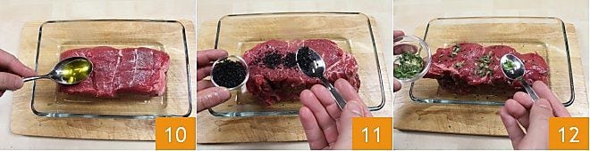 Übertragen Sie das Fleisch dann in eine Auflaufform und gießen Sie das Öl darüber 10, indem Sie Ihre Hände verwenden, um das Stück gut einzufetten. Bestreuen Sie das Fleisch mit dem schwarzen Hawaii-Salz 11 und den Thymianblättern 12.
