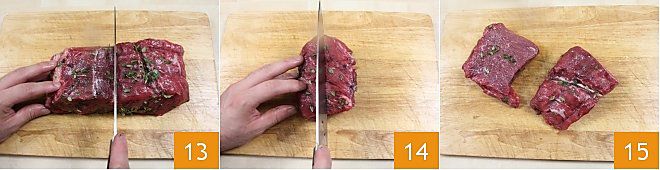 Übertragen Sie das aromatisierte Fleisch erneut auf das Schneidebrett und teilen Sie es in zwei Teile 13, dann schneiden Sie jeden erhaltenen Teil in zwei Hälften 14, um 4 Steaks zu erhalten 15.