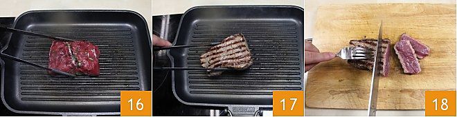 Erhitzen Sie eine Grillpfanne oder eine antihaftbeschichtete Pfanne sehr gut und braten Sie die Steaks auf beiden Seiten an (16-17), bis der gewünschte Garpunkt erreicht ist. Wenn Sie möchten, dass das Innere rosafarben und nicht trocken bleibt, braten Sie maximal 4-5 Minuten. Vermeiden Sie es, das Fleisch während des Kochens anzustechen, um zu verhindern, dass seine Flüssigkeiten austreten. Sobald es gekocht ist, übertragen Sie das Steak auf ein Schneidebrett und schneiden Sie es schräg, um genauere und kompaktere Scheiben zu erhalten 18.