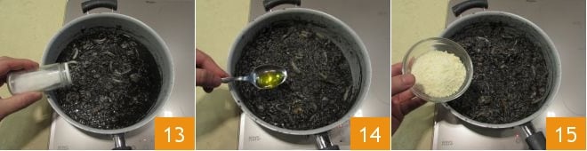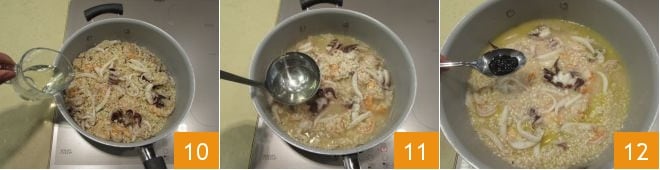 Löscht schließlich mit dem Wein ab 10: Lasst ihn verdampfen. Nun gebt die Gemüsebrühe hinzu 11: Gebt jedes Mal eine Kelle hinzu, sobald die vorherige vollständig absorbiert wurde. In der Mitte der Garzeit fügt ihr die Sepiatinte hinzu 12.