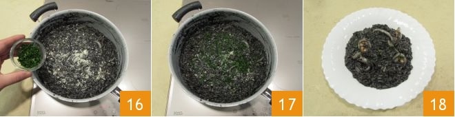Bestreut mit der Petersilie 16 und vermischt nochmals gut alle Zutaten, bis sie vollständig verbunden sind 17. Dann richtet euer Risotto mit Sepiatinte und Garnelen an 18 und serviert diese Köstlichkeit!