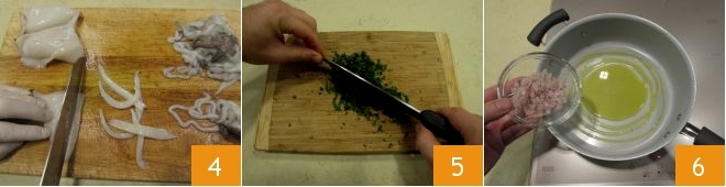 Nehmt die kleinen Sepien und schneidet sie in dünne Streifen 4, lasst die Tentakeln ganz, da sie mit ihren gekräuselten Formen das Risotto dekorieren werden. Wascht und trocknet die Petersilie sorgfältig, dann hackt sie sehr fein 5. Nehmt nun einen Topf mit Antihaftboden und hohen Rändern, in dem ihr die Schalotte mit 50 g Öl anbratet 6, während ihr weiter rührt.