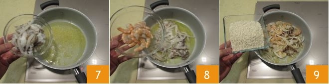 Nach 5-6 Minuten ist sie gut angeröstet: Fügt die kleinen Sepien 7 und auch die Garnelen in den Topf 8: Lasst den Fisch etwa 2 Minuten bei niedriger Hitze unter ständigem Rühren garen, damit er nicht am Topfboden klebt. Dann fügt ihr den Reis hinzu 9 und röstet ihn weitere 3 Minuten unter ständigem Rühren.
