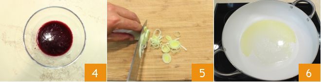 Um den Risotto mit Erdbeertrauben zuzubereiten, entfernen Sie zuerst die Trauben von den Rispen und spülen Sie sie gründlich unter fließendem Wasser ab 2. Pürieren Sie die Trauben durch eine Passiermaschine 2, wobei Sie einige zur Dekoration des Gerichts beiseite halten. Dann sieben Sie die Mischung durch ein Sieb 3.