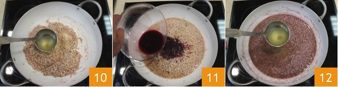 Fahren Sie mit dem Kochen fort, indem Sie bei Bedarf eine Kelle Gemüsebrühe hinzufügen 10. Um die Brühe zuzubereiten, folgen Sie unserem Rezept Gemüsebrühe. Geben Sie nun das Erdbeertraubenpüree hinzu 11, rühren Sie gut um, bis es absorbiert ist, immer bei schwacher Hitze. Fahren Sie mit dem Kochen Ihres Risottos mit Erdbeertrauben fort, indem Sie bei Bedarf eine Kelle Gemüsebrühe 12 hinzufügen, bis es vollständig gekocht ist, was etwa 20 Minuten dauert.