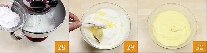 Fügen Sie den Puderzucker zur frischen Sahne hinzu 28 und schlagen Sie, bis die Mischung schaumig ist. Mischen Sie die geschlagene Sahne mit der Creme 29 und vermischen Sie alles 30.