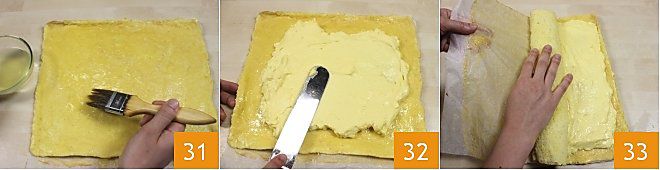 Jetzt nehmen Sie den Biskuitteig, der inzwischen abgekühlt ist, und tränken ihn mit dem Limoncello-Sirup, den Sie beiseite gestellt haben 31, indem Sie einen Pinsel verwenden. Dann fahren Sie mit dem Füllen fort: Verteilen Sie die Hälfte der vorbereiteten Limoncello-Creme, wobei Sie darauf achten, 1 cm Abstand zum Rand zu lassen 32. Rollen Sie ihn vorsichtig auf, indem Sie ihn vom Backpapier lösen und versuchen, ihn so fest wie möglich zu rollen, aber achten Sie darauf, ihn nicht zu brechen 33.