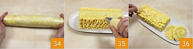 Wickeln Sie die gebildete Rolle in Frischhaltefolie 34, ziehen Sie sie fest und lassen Sie sie für mindestens 2 Stunden im Kühlschrank fest werden. Sobald sie abgekühlt ist, entfernen Sie die Folie und legen Sie sie auf eine Servierplatte. Geben Sie die andere Hälfte der Limoncello-Creme in einen Spritzbeutel mit Sterntülle und dekorieren Sie die Rolle auf ihrer gesamten Oberfläche 35. Garnieren Sie mit Zitronenscheiben 36 und Ihre Rolle mit Limoncello-Creme ist servierfertig!