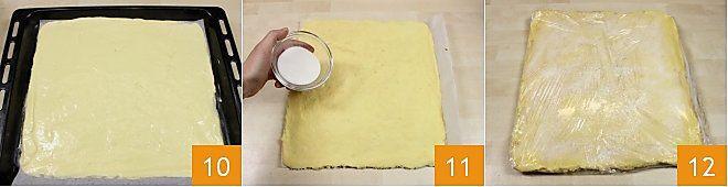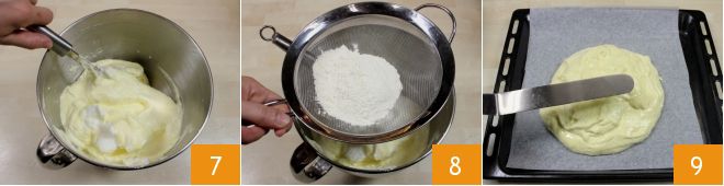 indem Sie einen Spatel verwenden und darauf achten, sie nicht zu entlüften. Schließlich die gesiebte Mehl hinzufügen 8, mischen und nachdem Sie ein Backblech von 45x37 cm mit Backpapier ausgelegt haben, den erhaltenen Teig darauf gießen 9.