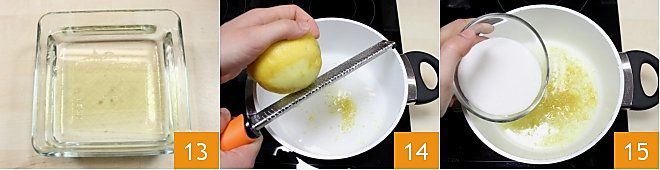 Bereiten Sie nun die Creme vor: Weichen Sie die Gelatineblätter in kaltem Wasser ein 13. Erhitzen Sie Wasser in einem kleinen Topf, reiben Sie die Schale einer Zitrone hinein 14 und fügen Sie dann den Zucker hinzu 15.