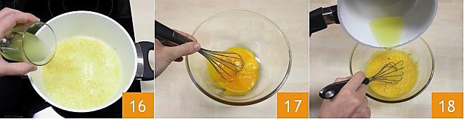Fügen Sie auch die Limoncello-Dosis hinzu 16 und bringen Sie es zum Kochen. In der Zwischenzeit schlagen Sie die Eigelbe mit einem Schneebesen 17 und wenn der Mix kocht, nehmen Sie ihn vom Herd und gießen ihn in die Schüssel mit den geschlagenen Eigelben 18.