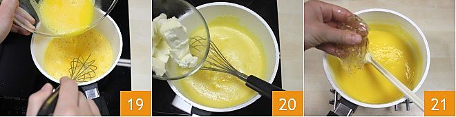 Rühren Sie die Mischung gut mit dem Schneebesen um und gießen Sie sie dann erneut in einen kleinen Topf, in dem Sie sie bei schwacher Hitze kochen 19. Lassen Sie sie köcheln und bei den ersten Anzeichen des Aufkochens, fügen Sie die in Würfel geschnittene Butter hinzu 20, dann rühren Sie und lassen Sie sie weiterhin bei schwacher Hitze für 2-3 Minuten kochen. Nach dieser Zeit nehmen Sie den kleinen Topf vom Herd und fügen die gut ausgedrückte Gelatine hinzu 21.