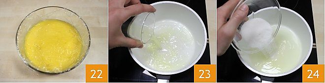 Rühren Sie erneut um und gießen Sie die erhaltene Creme in einen breiten und flachen Behälter, den Sie mit Folie abdecken, sodass die Folie an der Creme haftet 22. Zu diesem Zeitpunkt stellen Sie die Creme in den Kühlschrank (oder in den Gefrierschrank, wenn Sie den Vorgang beschleunigen möchten), bis sie gut abgekühlt ist. Während die Creme abkühlt, bereiten Sie den Sirup zu: Gießen Sie das Wasser in einen kleinen Topf, fügen Sie den Limoncello 23, den Zucker 24 hinzu und bringen Sie es zum Kochen. Sobald die Flüssigkeit kocht, schalten Sie den Herd aus und stellen Sie sie beiseite.