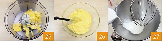 Sobald die Creme fest geworden ist, geben Sie sie in einen Mixer 25 und mixen Sie sie für ein paar Sekunden, bis sie eine dichte und cremige Konsistenz erreicht 26. Dann schlagen Sie die Sahne: Gießen Sie die frische Sahne in die Schüssel einer Küchenmaschine (oder in eine Schüssel, wenn Sie einen elektrischen Mixer verwenden) 27.