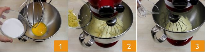 Um die Rolle mit Limoncello-Creme zuzubereiten, beginnen Sie mit dem Biskuitteig. Trennen Sie die Eier und teilen Sie die Eigelbe von den Eiweißen. Geben Sie dann die Eigelbe in die Schüssel einer Küchenmaschine (wenn Sie keine Küchenmaschine haben, verwenden Sie eine normale Schüssel und dann einen elektrischen Mixer) und fügen Sie die Hälfte der Zuckermenge hinzu (70 g) 1. Während Sie die Eigelbe mit dem Zucker schaumig schlagen, fügen Sie die geriebene Zitronenschale hinzu 2. Danach den Limoncello 3 in die Mischung einarbeiten, während Sie weiter schlagen, bis die Mischung homogen und cremig ist.