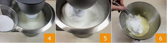 Nun geben Sie die beiseite gestellten Eiweiße in die Schüssel einer Küchenmaschine (oder eine normale Schüssel, um dann einen elektrischen Mixer zu verwenden) und fügen Sie den restlichen Zucker hinzu (70 g) 4. Schlagen Sie die Eiweiße zu einem nicht zu festen Eischnee, damit keine Klumpen entstehen, wenn Sie sie zu den anderen Zutaten hinzufügen 5. Rühren Sie die steif geschlagenen Eiweiße vorsichtig unter den restlichen Teig 6,