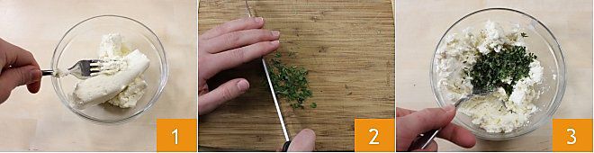 Um die Rosetten aus rohem Schinken auf klassischen Blätterteig zuzubereiten, beginnen Sie mit der Zubereitung der Ziegenkäsecreme: Geben Sie den Ziegenkäse in eine Schüssel und arbeiten Sie ihn mit einer Gabel zu einer Creme 1. Zerkleinern Sie die Kräuter 2 und fügen Sie sie der Ziegenkäsecreme hinzu 3