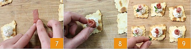 Mischen Sie gut, um alle Zutaten zu verbinden, fügen Sie einen Schuss natives Olivenöl extra hinzu, um den Käse weicher zu machen 4, dann salzen und pfeffern Sie nach Belieben. Dann füllen Sie die Mischung in einen Spritzbeutel mit Sterntülle und drücken Sie einen Klecks Ziegenkäsecreme auf jedes Blätterteigstück 5. Schneiden Sie dann die Schinkenscheiben in etwa 1 cm breite Streifen 6