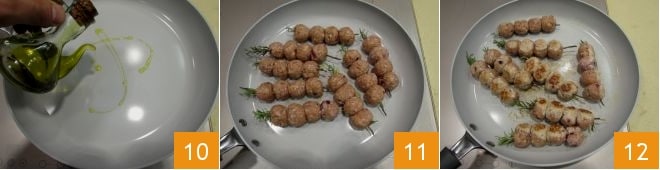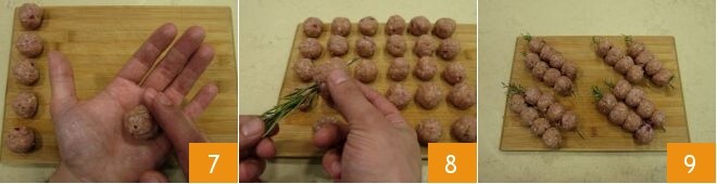 Teilen Sie die Fleischmasse in kleine Portionen von etwa 15 g und rollen Sie sie in Ihrer Handfläche zu Fleischbällchen 7. Sie sollten 32 Stück erhalten. Nehmen Sie nun einen Rosmarinzweig, entfernen Sie einige Nadeln und stecken Sie vorsichtig, eines nach dem anderen, 4 Fleischbällchen darauf 8. Fahren Sie so fort, bis Sie 8 Spieße haben 9.