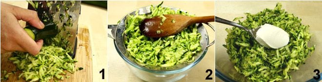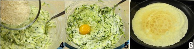 Um die Pfannkuchenrolle mit Zucchini zuzubereiten, beginnen Sie damit, die Zucchini zu waschen, die Enden abzuschneiden und sie mit einer groben Reibe zu reiben 1; drücken Sie sie dann mit einem Sieb gut aus 2 und sammeln Sie sie in einer Schüssel. Fügen Sie dann den Philadelphia-Käse 3 und die Béchamelsoße hinzu, die Sie mit den oben angegebenen Mengen und nach dem Verfahren, das Sie Béchamel, zubereitet haben.