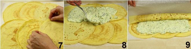 Legen Sie auf ein mit Butter bestrichenes Backpapier die Crêpes so übereinander, dass sie ein Rechteck bilden 7, verteilen Sie die Zucchini- und Philadelphia-Mischung in der Mitte des Rechtecks 8 und rollen Sie die Crêpes mit Hilfe des Backpapiers auf 9