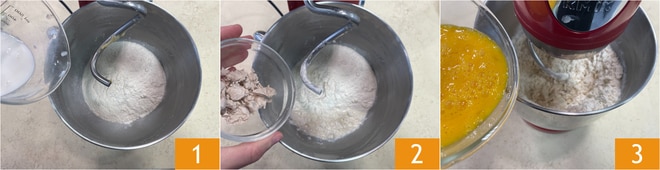 Um die Schokotaschen zuzubereiten, empfehlen wir die Verwendung einer Küchenmaschine, aber wenn Sie keine haben, kneten Sie von Hand in derselben Reihenfolge. Geben Sie also das Mehl zusammen mit der Milch 1 und der zerbröckelten Hefe 2 in die Schüssel. Schalten Sie die Küchenmaschine mit dem Haken bei mittlerer Geschwindigkeit ein und geben Sie die zusammen verquirlten Eier und das Eigelb nach und nach hinzu 3.