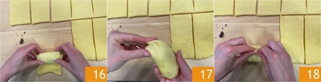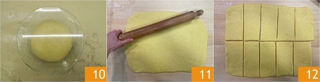 Wenn der Teig sich verdoppelt hat 10, legen Sie ihn auf die leicht bemehlte Arbeitsfläche und formen Sie ein Rechteck von 30 cm x 40 cm. Teilen Sie es in zwei und schneiden Sie 10 Stücke von 15 cm x 8 cm 12.