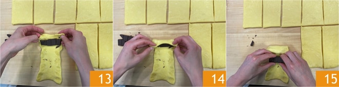 Um die Schokotaschen zu formen, gehen Sie folgendermaßen vor: Nehmen Sie das erste Teigrechteck und drücken Sie es vorsichtig flach, dann legen Sie ein Stück Schokoladentafel in den oberen Teil 13 und beginnen Sie, es fest aufzurollen 14. Legen Sie auf halber Strecke den zweiten Schokoladenstreifen 15