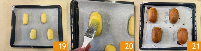 Wenn Sie alle vorbereitet haben, legen Sie sie auf ein mit Backpapier ausgelegtes Backblech, lassen Sie dabei etwas Abstand 19. Decken Sie sie mit Folie ab und lassen Sie sie etwa 30 Minuten gehen. Bestreichen Sie dann die Oberfläche mit Eigelb und Sahne 20. Backen Sie die Schokotaschen im statischen Ofen bei 200° für etwa 15 Minuten und senken Sie dann auf 180°, um die Backzeit um weitere 10 Minuten zu verlängern. Ihre Schokotaschen sind jetzt fertig 21.