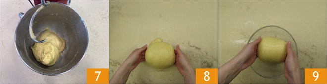 Wenn die Butter eingearbeitet ist, fügen Sie das Salz hinzu und nach ein paar Minuten ist der Teig fertig 7. Geben Sie ihn auf die Arbeitsfläche und lassen Sie ihn 5 Minuten unter einer Schüssel ruhen. Geben Sie ihm mit nassen Händen ein paar Falten zur Verstärkung, indem Sie den Teig anheben und nach vorne legen, um ihn dann zu sich zu ziehen 8. Geben Sie ihn in eine Schüssel, decken Sie ihn ab und lassen Sie ihn auf das Doppelte aufgehen, das dauert ca. 2 Stunden 9.
