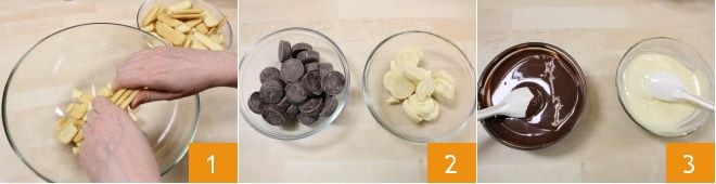 Um den Salami mit zwei Schokoladen zuzubereiten, beginnen Sie mit der Zubereitung der weißen Schokoladenmasse, die Sie für das Herz des Salamis benötigen. Brechen Sie 100 g trockene Kekse (oder Pavesini) grob mit den Händen und legen Sie sie beiseite 1. Dann schmelzen Sie getrennt in der Mikrowelle oder im Wasserbad die dunkle und die weiße Schokolade und legen Sie sie beiseite (2-3).