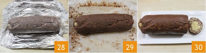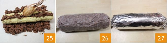 den Sie in die Mitte der dunklen Schokoladenmasse legen werden 25. Bedecken Sie es mit einem Teil der Schokoladenmasse und verdichten Sie die Masse um das Herz herum, um ihr die Form einer Wurst zu geben. Wickeln Sie den Salami zuerst fest in Backpapier, als ob Sie ein Bonbon formen würden 26 und dann in Alufolie 27, sodass er unter Druck bleibt, und lassen Sie ihn 2-3 Stunden im Kühlschrank fest werden.