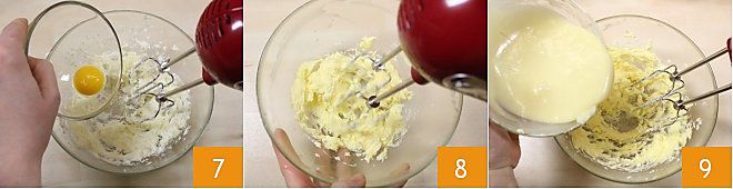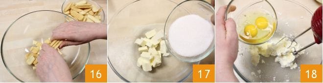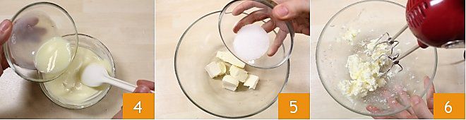 Fügen Sie der geschmolzenen weißen Schokolade die erhitzte Kondensmilch mit der Sahne hinzu 4, und vermischen Sie alles gut, lassen Sie es bei Raumtemperatur abkühlen. Falls die entstandene Masse zu dickflüssig sein sollte, fügen Sie ein paar Esslöffel heiße Sahne hinzu. In einer anderen Schüssel geben Sie die bei Raumtemperatur weiche Butter und den Zucker 5, schalten Sie den elektrischen Mixer ein und schlagen Sie alles, um eine cremige Masse zu erhalten 6.