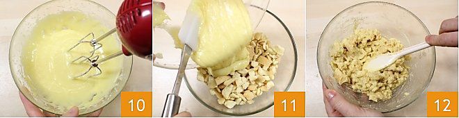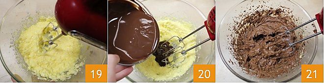 und schlagen weiter, um sie einzubeziehen, und wenn Sie eine weiße und schaumige Masse erhalten haben 19, fügen Sie die zuvor geschmolzene, inzwischen abgekühlte dunkle Schokolade hinzu 20 und arbeiten Sie die Masse, bis Sie eine homogene Konsistenz erhalten 21.