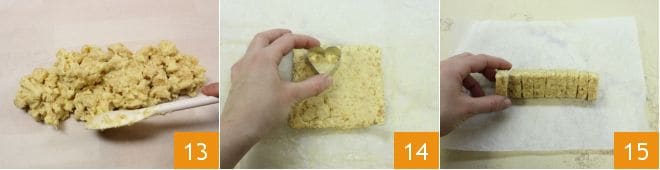 Legen Sie anschließend die erhaltene Keksmasse zwischen zwei Blätter Backpapier 13 und drücken Sie sie mit einem Nudelholz, um ihr eine quadratische Form mit einer Dicke von etwa 1 cm zu geben 14, und stellen Sie sie in den Kühlschrank, damit sie fest und kompakt wird. Dann stechen Sie mit einem herzförmigen Keksausstecher 9 Herzchen aus, legen Sie sie in einer Reihe auf ein Blatt Backpapier, eines neben dem anderen 15, wickeln Sie das Backpapier um die Herzen und verschließen Sie die Enden fest wie ein Bonbon, lassen Sie es für eine halbe Stunde im Gefrierschrank fest werden.