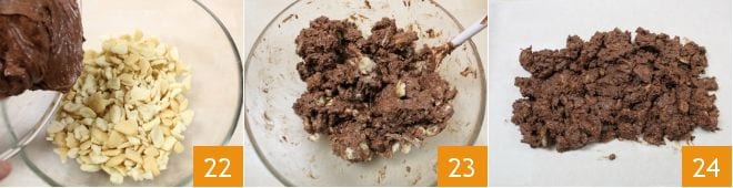 Fügen Sie die Schokoladenmasse zu den zerbröckelten Keksen hinzu 22, vermischen Sie alles 23, bedecken Sie es mit Frischhaltefolie und stellen Sie es für etwa 15 Minuten in den Kühlschrank, um es fest werden zu lassen. Legen Sie dann die Masse auf ein Blatt Backpapier und formen Sie ein Rechteck 24, das groß genug ist, um den weißen Teil vollständig zu bedecken.