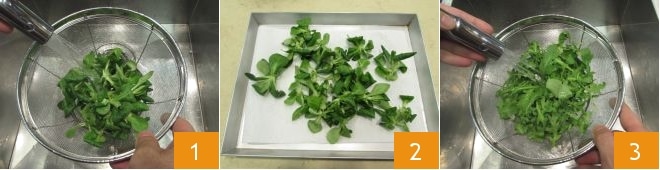 Um den Salat mit Erdbeeren und Balsamico zuzubereiten, waschen Sie zunächst den Feldsalat unter reichlich frischem fließendem Wasser 1, trocknen Sie ihn vorsichtig mit einem sauberen Tuch ab 2 und zupfen Sie ihn dann mit den Fingern klein. Verarbeiten Sie die Rucola auf die gleiche Weise 3,