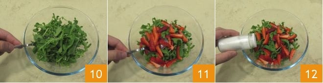 Nehmen Sie eine ziemlich große Salatschüssel 10 und geben Sie den Salat und die Erdbeeren hinein 11; fügen Sie dann das Salz hinzu 12,