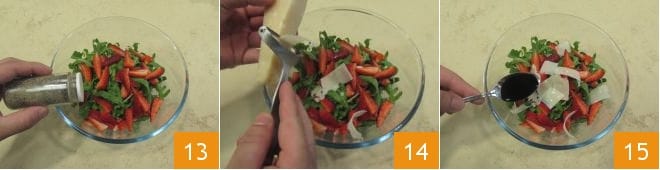 frisch gemahlenen Pfeffer 13 und fein geschnittenen Parmesan 14. Würzen Sie mit einem Esslöffel Balsamico-Essig 15